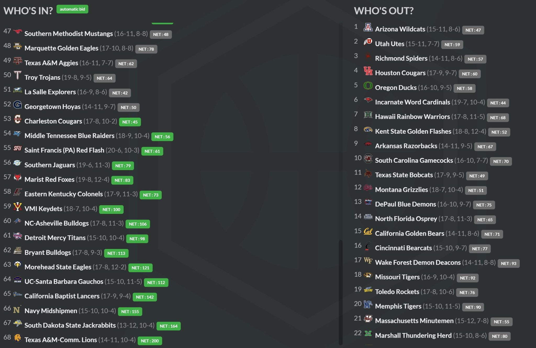 Another team that is usually much better is Oregon (16-10) who is said to be on the outside looking in.