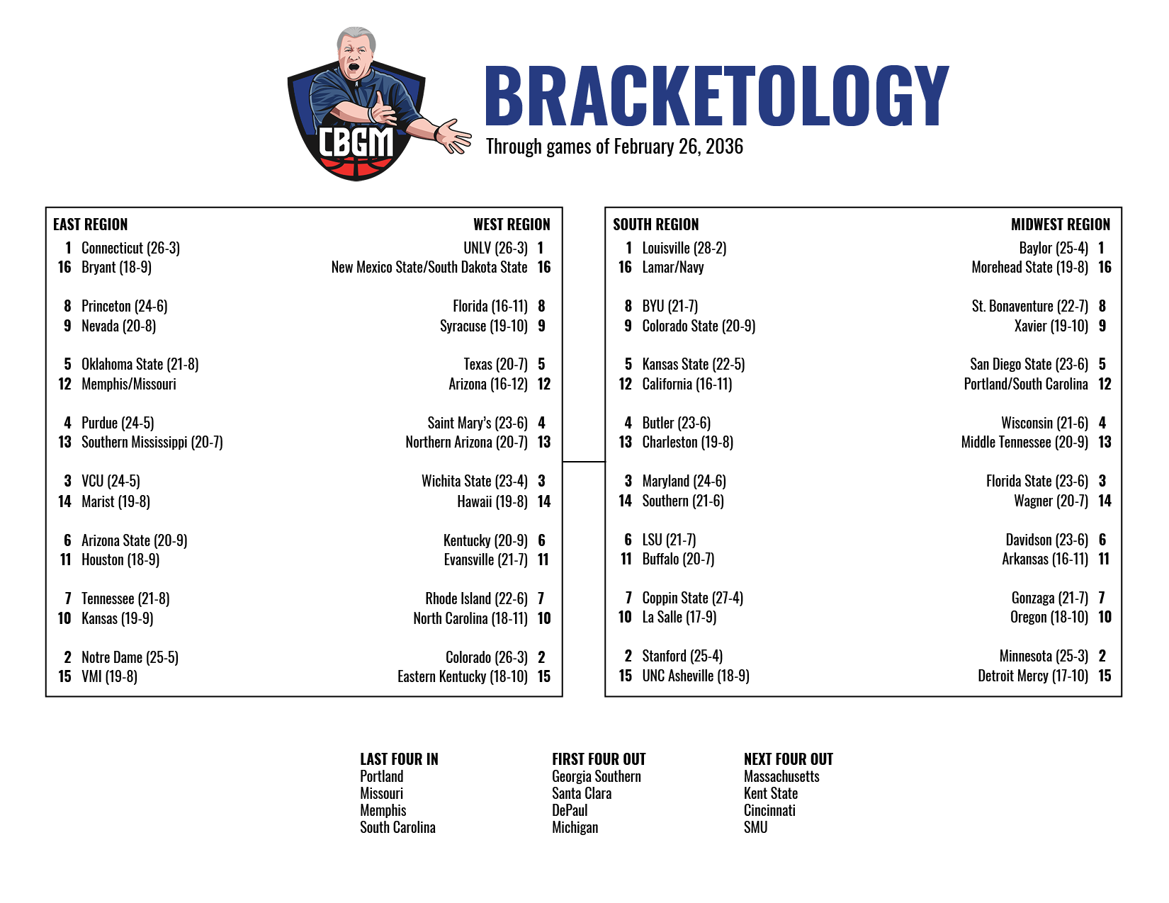 There’s just one week left in the regular season, and it’s a very tough bracket to predict. The conference tournaments should produce even more havoc, meaning this will probably be the last β€œchalk” bracketology before things start going sideways in a couple of sims. Bid stealers are lurking everywhere.