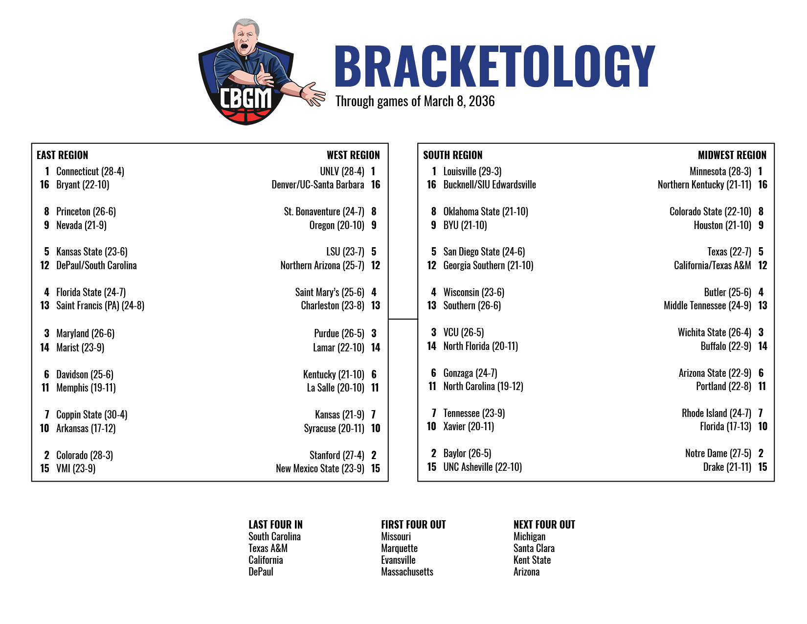 5. This is not a prediction of what the actual bracket will end up being in the game. It is a prediction of what the bracket would be if this season occurred in real life right now and was picked by the NCAA committee.