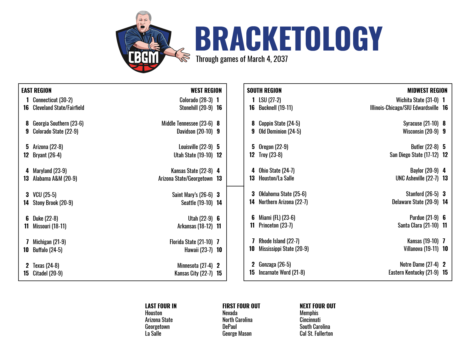 There are lots of strong mid-major programs this season, and the bracket right now has the play-in at-large games on the 13 seed line β almost unprecedented. But thatβs what happens when teams like Buffalo, Georgia Southern, Princeton, Old Dominion, Coppin State, Middle Tennessee and Hawaii have such solid resumes. If any of the above teams lose in their league tournament, they are still on track to be in the field. You know what this means β bubbles will burst in the high-major conferences with each loss. Such is life in CBGM, when the AI canβt keep up with savvy human owners at the mid-major level. So I expect numerous at-large bids for mid-major schools, plus automatic bids that will make folks cry β most likely from our last four in right now in Houston, Arizona State, Georgetown and La Salle.
