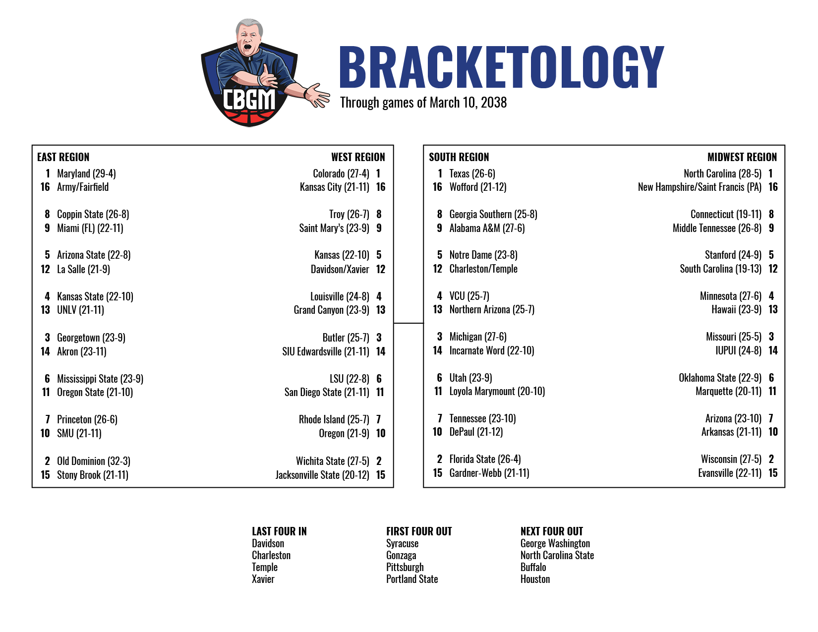 Temple can really help itβs at-large case with a win over SMU in the AAC semis. We have the Owls as one of the last four in right now. Charleston is also in the field despite losing in the CAA tournament. Xavier has squeezed in at 21-11, the final at-large berth.