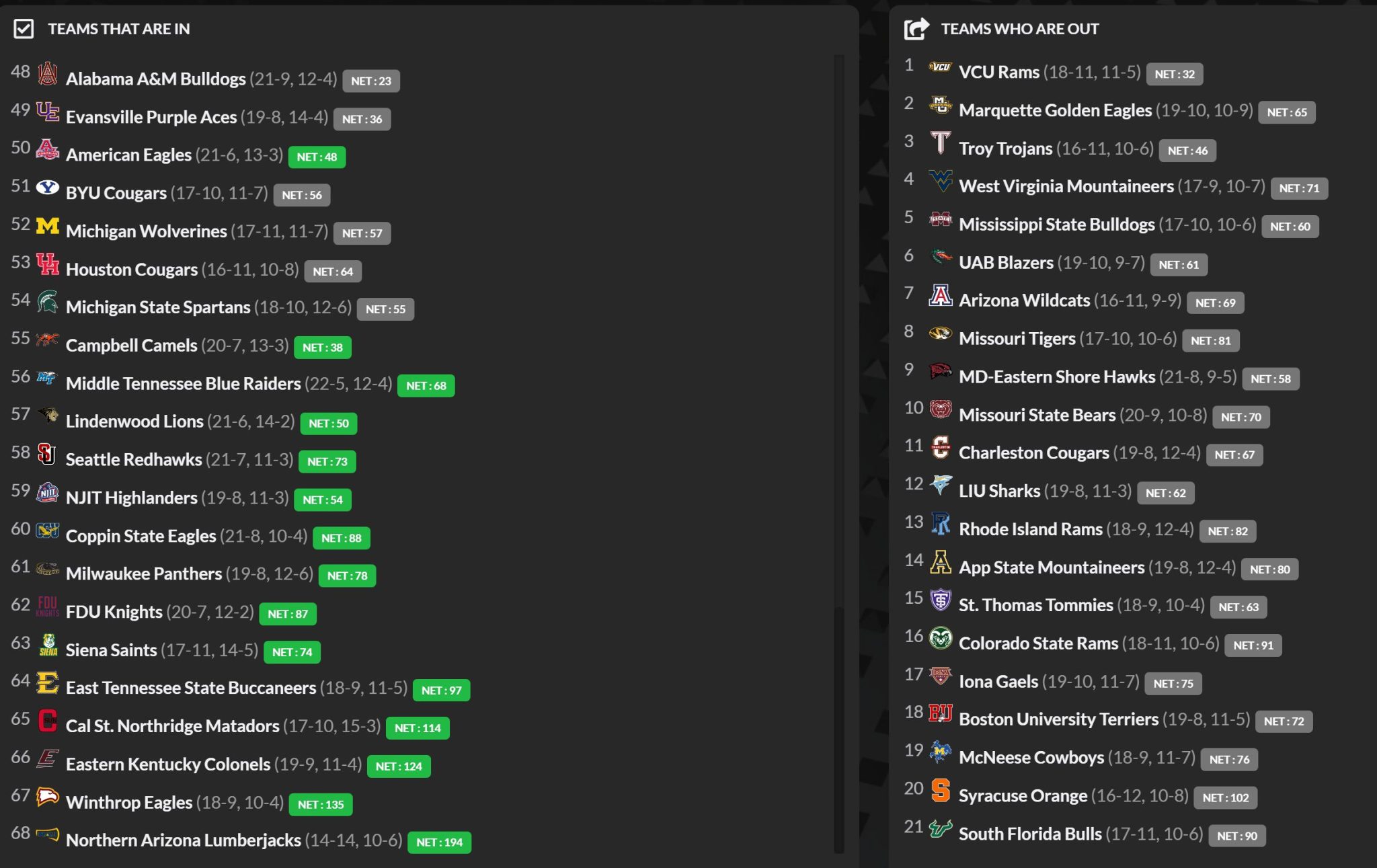The β€œteams who are out” side is filled with familiar names, the kind of programs fans expect to see every March: