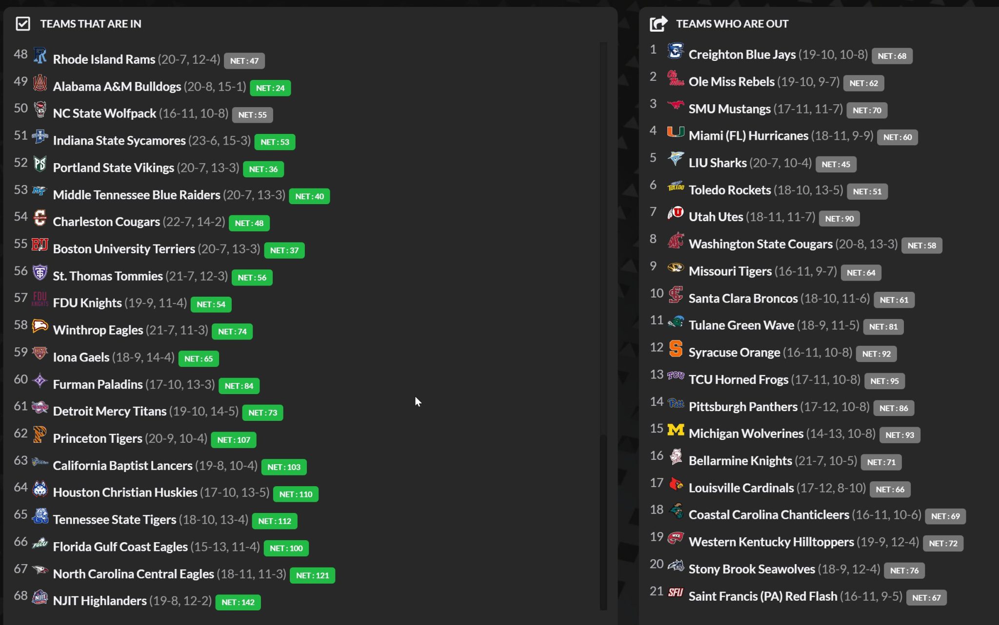 On the βteams that are inβ side, itβs a wave of mid-majors and fringe leagues forcing their way into the conversation with strong records and tournament-ready profiles: