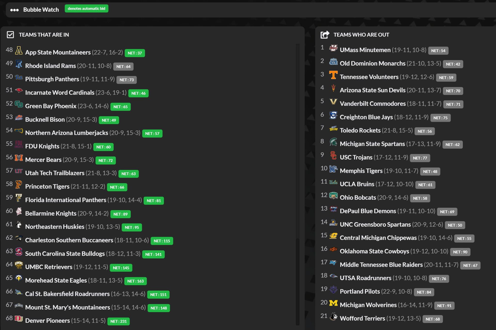 App State Mountaineers (22–7, 16–2, NET: 37) – App State has one of the strongest profiles on either side of the bubble. A top-40 NET and dominant league record make them look safely in.