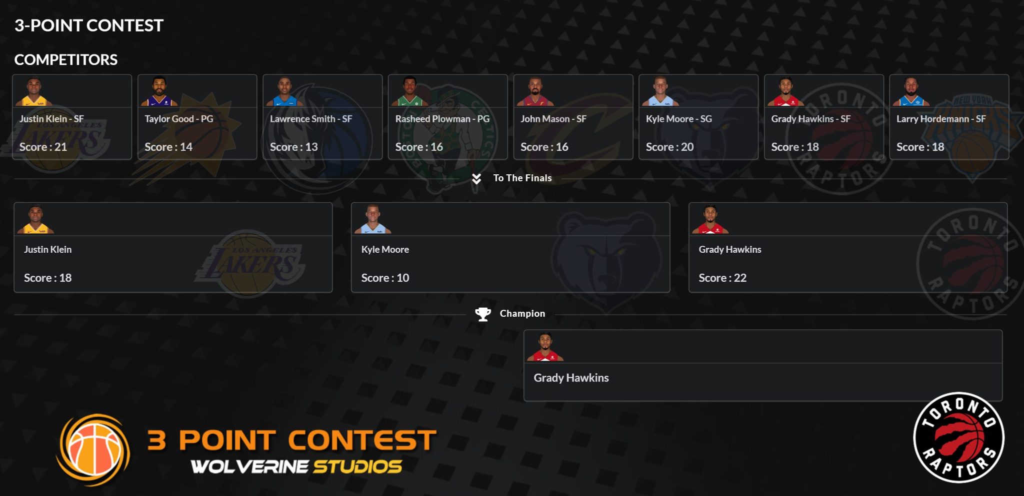 That leaves an aging vet in Grady Hawkins (Oregon) at 34 years old winning the 3 pt shootout! Way to go.
