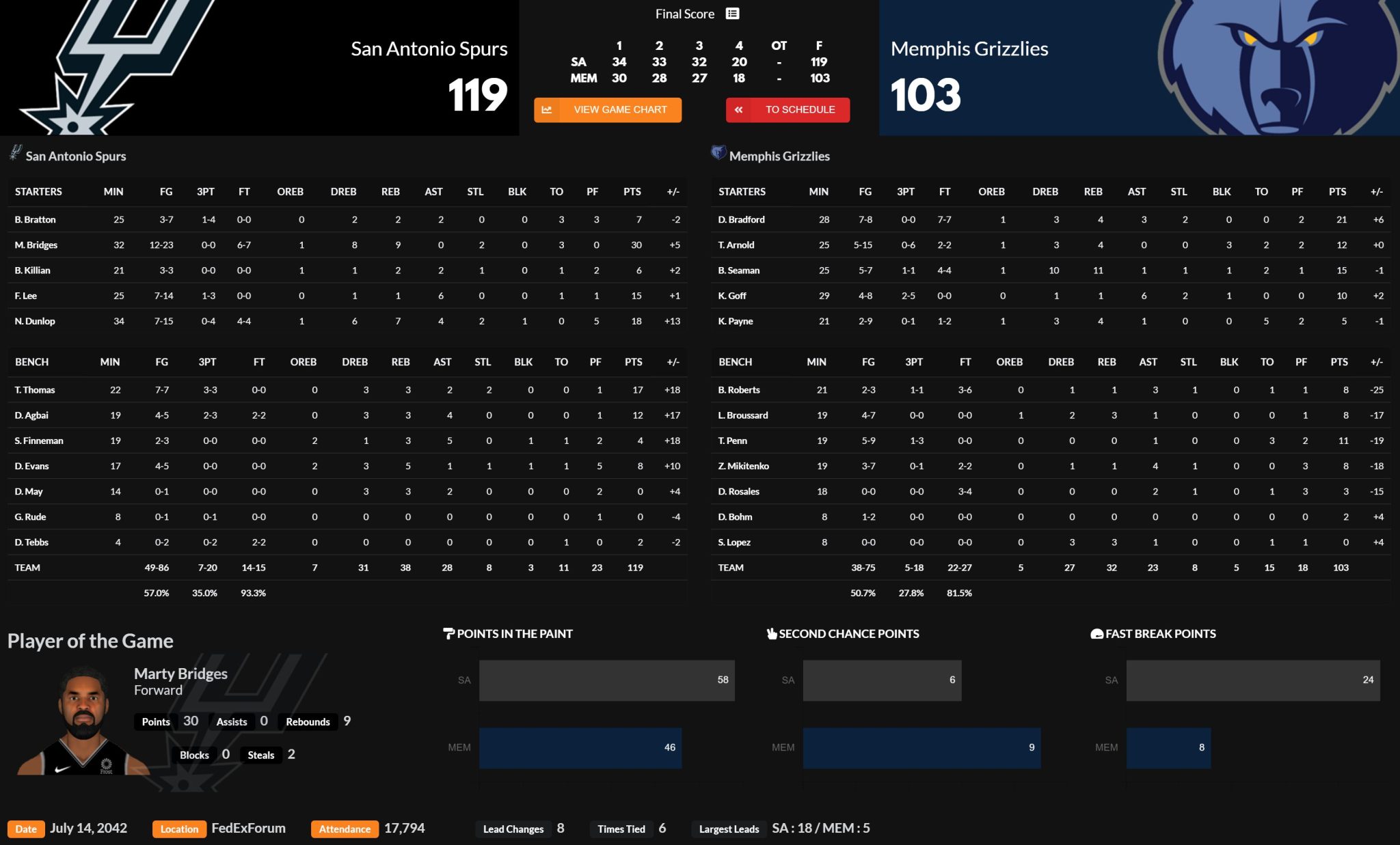 Marty Bridges (Miami) was the top player for the Spurs. Pouring in 30 Pts and 9 Rebs. He had a nice summer league last time too for the Spurs.