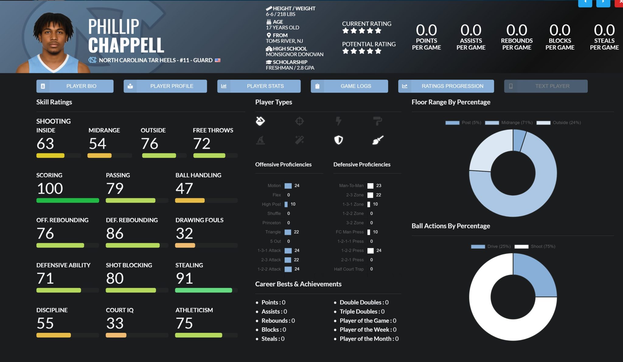 Defensively, he brings effort and toughness. He’s not a lockdown guy yet, but his anticipation and length make him disruptive, and he’ll battle on the glass like a forward. What holds him back right now is his handle and decision-making — he can get loose with the ball and disappear when the pace picks up. But when he slows the game down, his scoring instincts take over. Chappell looks like the kind of guard who can quietly pile up points and frustrate opponents with his poise. If North Carolina can keep him engaged and confident, he could evolve into one of those steady, reliable guards every great team needs.
