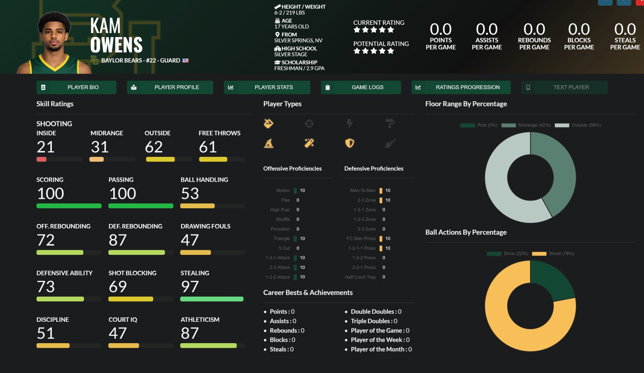 Owens walks in as a high-usage engine with two elite carry traits right away: Scoring 100 and Passing 100. Baylor’s getting a creator who can run offense and generate points even if the rest of his skill mix is still uneven. His shot profile leans perimeter (58% outside / 42% midrange) and he’s not just a stationary gunner either (22% drive), so the ball can live in his hands without the offense stalling out.