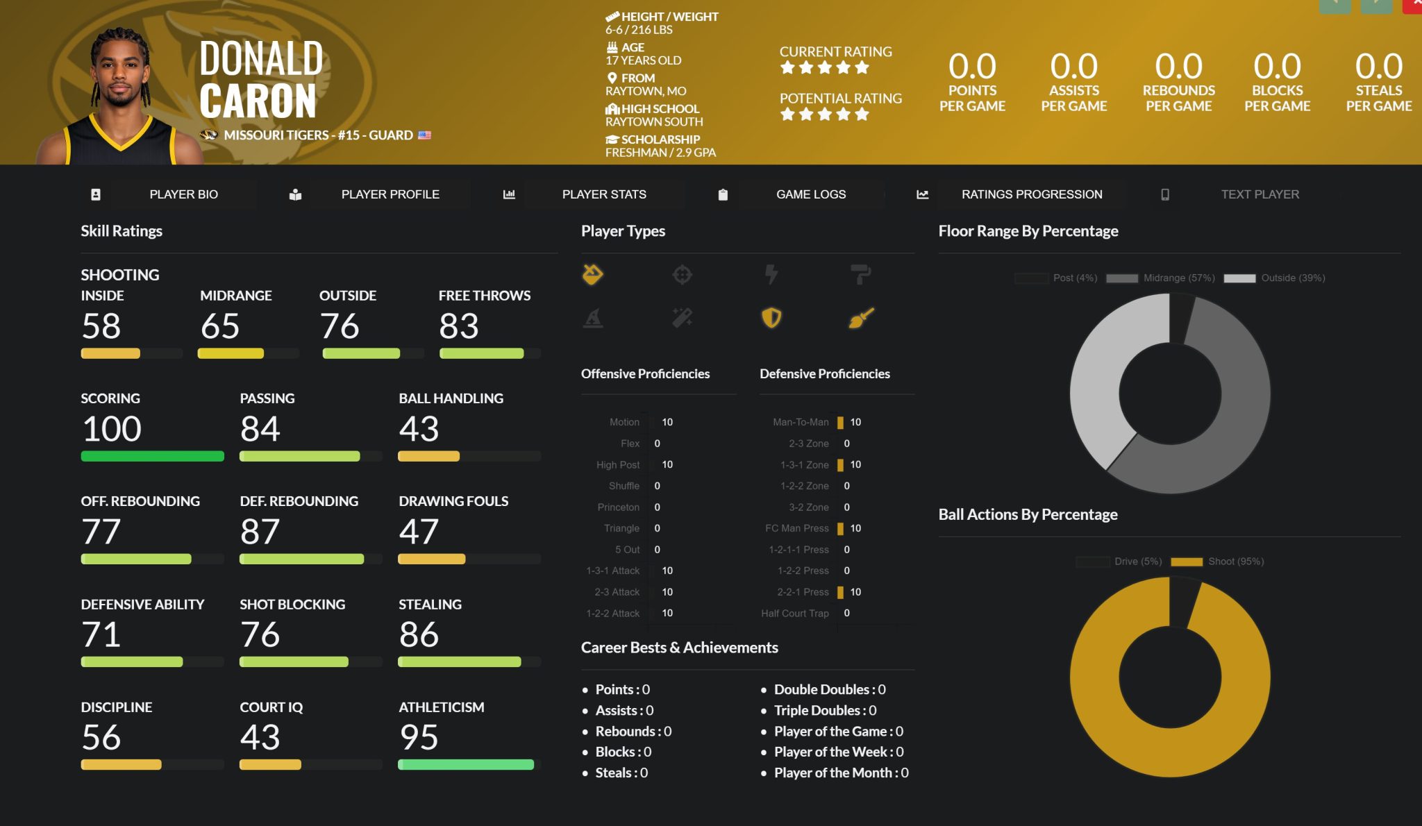 Where he really separates is the physical + secondary impact package. Athleticism 95 at 6’6” gives Missouri a high-ceiling finisher and matchup piece, and he rebounds like a forward (77 OREB / 87 DREB). Defensively he’s productive across multiple play types: Stealing 86, Shot Blocking 76, Defensive Ability 71 — that’s real two-way utility, especially when he’s used to swallow space and contest at the point of attack.
