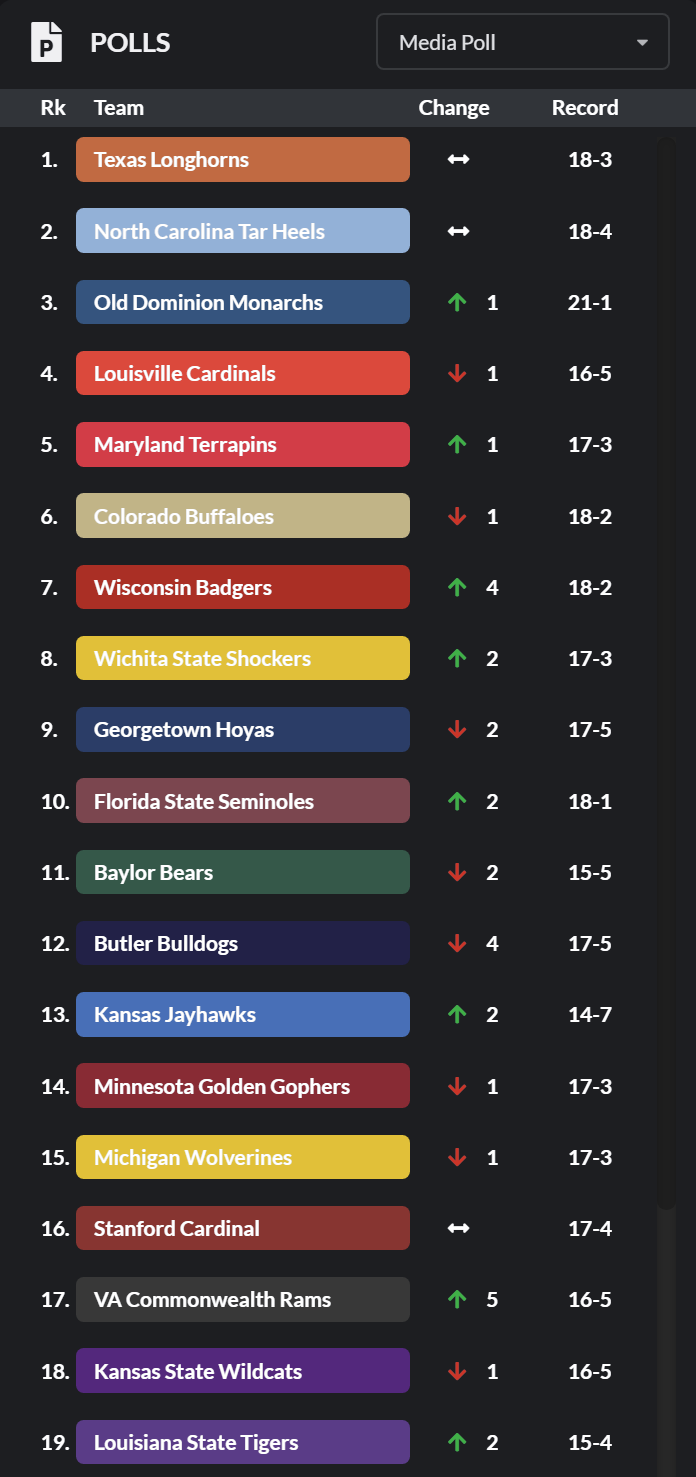 Old Dominion (20-1) has finally taken a blemish. Still a very respectable #3 position at this stage of the season!