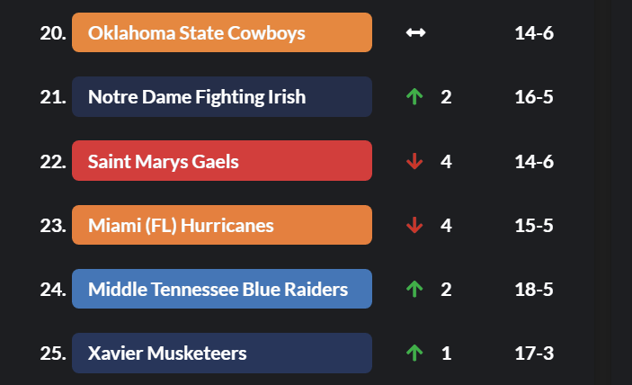 Notable story also Middle Tennessee at #24 (18-5) is playing great ball.