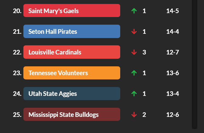 This poll shows a clear power shift at the very top with Baylor asserting control, while chaos continues in the 10β25 range. Several traditional powersβLouisville, Maryland, and Purdueβare trending down just as Wichita State, Minnesota, Creighton, and Saint Maryβs gain real momentum. The middle of the country is extremely volatile, and weekly swings are now becoming the norm instead of the exception.