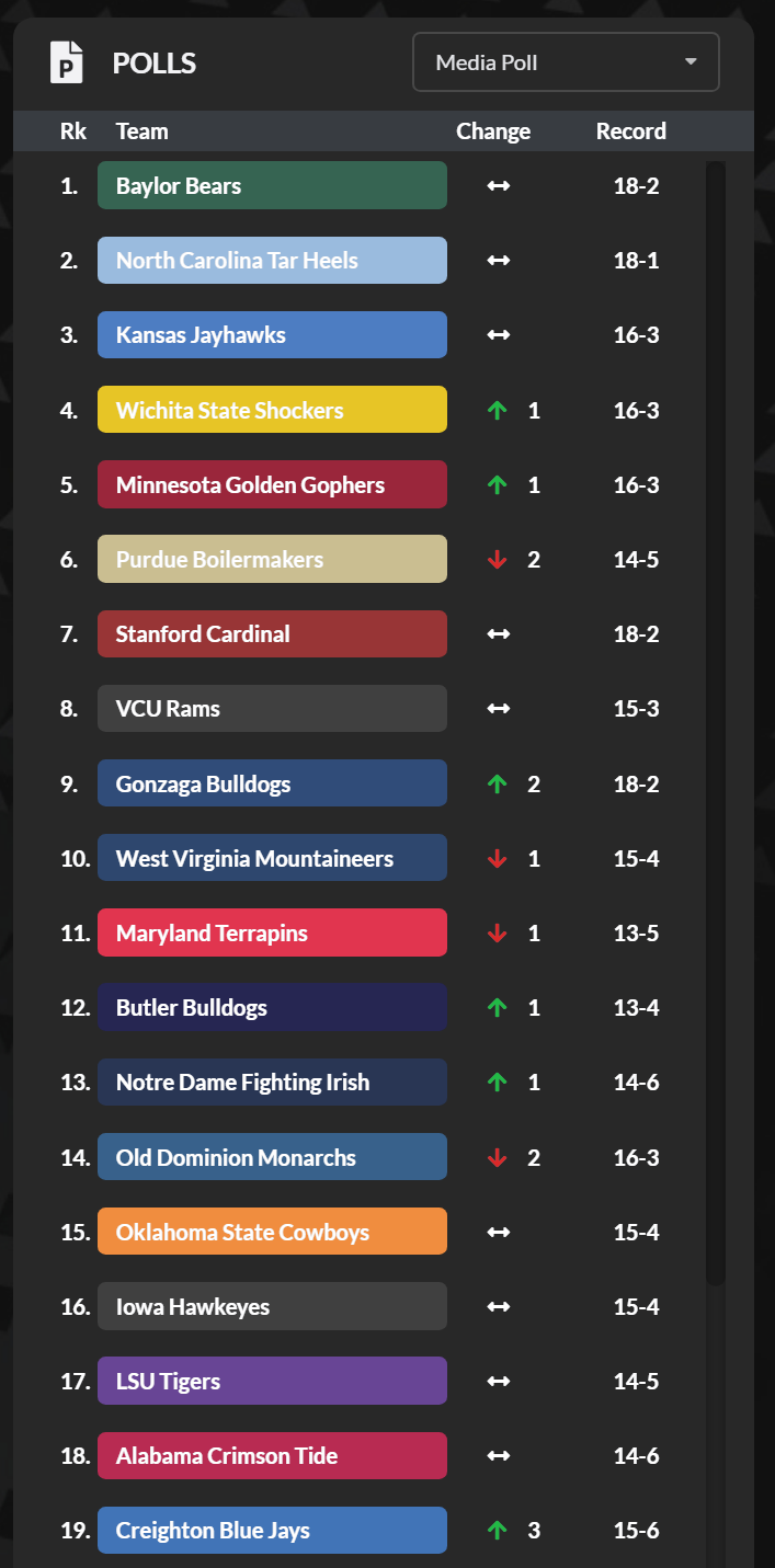 This poll shows a clear power shift at the very top with Baylor asserting control, while chaos continues in the 10β25 range. Several traditional powersβLouisville, Maryland, and Purdueβare trending down just as Wichita State, Minnesota, Creighton, and Saint Maryβs gain real momentum. The middle of the country is extremely volatile, and weekly swings are now becoming the norm instead of the exception.